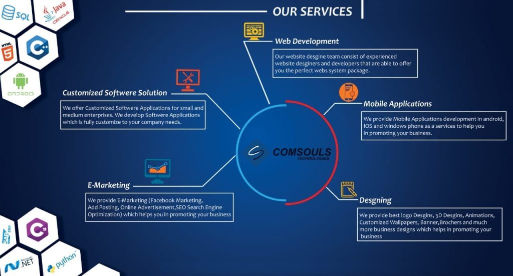 ComSouls Technologies is a company of Creative minds and tech individuals. We deal in complete IT services that include software development and services, hardware supply and maintenance, server installation, IT infrastructure and architecture, Domain and hosting services. Our software development services include website designing and web solutions, android mobile application development and services and customized business intelligent solutions. ComSouls is dealing with its international clients remotely and providing services. Company has its complete focus in maintaining a good relationship with its local and international clients.